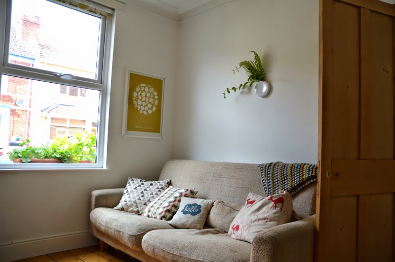 I love our big sofa, it was a lucky Freecycle find. In fact, most of the things in the room have either been ‘found’ or cost no more than £20. On the sofa are cushions I have made and bought, including some by Donna Wilson and Hello Milky. On the wall by the window is one of my favourite prints, it’s by Bold and Noble and is called ‘Trees around Britain’. Are you noticing a nature theme here?