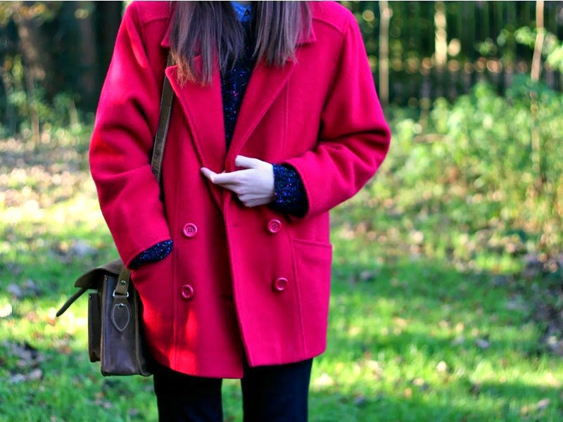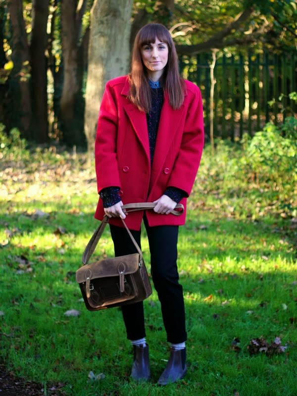 I’ve been waiting for it to get really chilly, so I can finally wear one of the three hundred* coats I’ve found in charity shops lately, which meant I was more than happy to get up and see the frost glistening on the grass. I saw an oversized, double breasted coat in one of the high street shops a few weeks ago, but my inner tightwad scoffed at the £90 price tag – so when I saw this red one in my local Sue Ryder shop for £4.75 (£4.75! That’s less than a fiver!), I practically ran to the till with it. What makes it even better is that a) it’s the most beautiful shade of red and b) it’s pure wool, which means it’s really, really warm. I popped it over an old denim shirt, a vintage jumper and decided on some skinny black trousers; I’m experimenting with attempting to wear trousers rather than jeans lately, but to be honest, I’m not really sure how I feel about them. These ones weren’t quite as skinny as I’d hoped, but I do like the way they’re slightly tapered at the bottom – it’s nice to be able to wear a denim shirt on the top half as well, without feeling like I’ve stepped out of the eighties (I know some people do double denim, but it just looks ridiculous on me). I finished it off with a satchel by Scaramanga, some polka dot socks and bargain eBay chelsea boots.