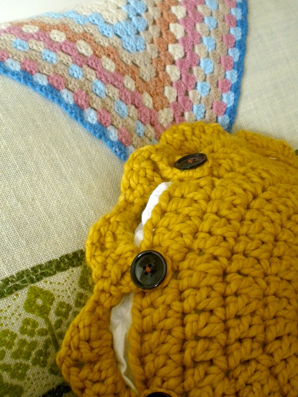 So I was left feeling pretty darn pleased with myself this week when I finally finished the yellow bobble cushion – all I had left to do was to sew on three buttons and make the loops from chain stitches, but there just never seemed to be time. Two weeks later…. it’s finished! Drum roll please….. drrrrrrrr……. ta dah!