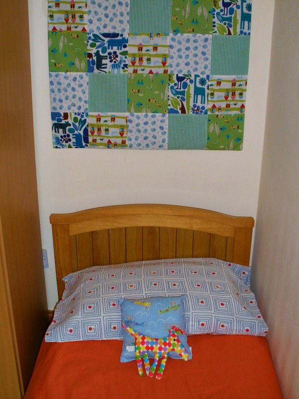 It’s really nothing fantastically technical, and isn’t actually even quilted (once I had all the squares sewn together, I couldn’t bare the thought of trying to quilt it, and the whole lot just going terribly wrong, so I completely bottled out and just stitched a back on!) – if you look closely you can see that some of the squares don’t actually match up exactly, oh dear! Still, the Boy was absolutely over the moon with it, and I managed to time it so that it went up on the same day that we took the sides off of his cot. He is now the proud owner of one ‘big boy bed’, complete with animal wall hanging – I do want to get some vegetable crates (or something similar – is that a cliche now? Probably, never mind!) to attach to the wall to hold his toys and books, but for now, his room is looking pretty sweet.