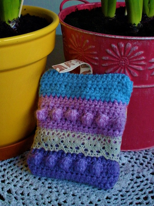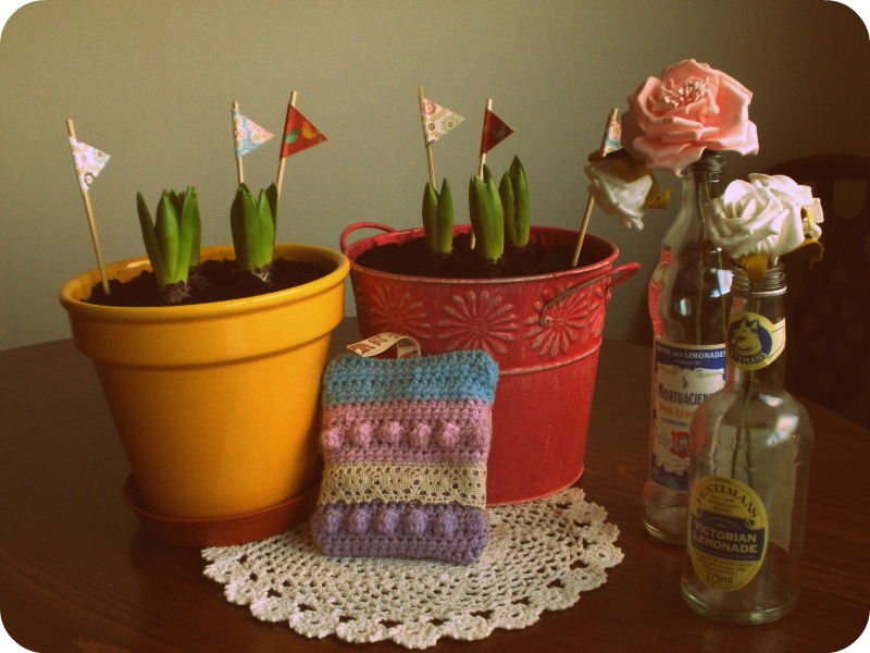 Little paper flags! Far sturdier, and easily removed for watering, brilliant! I also crocheted her a small scented bag, filled with dried lavender from a bag she bought me when we went to a local lavender farm last year – technically, this was the Boy’s present to her, and was accompanied by a framed photograph I’d taken of him amongst the fields….