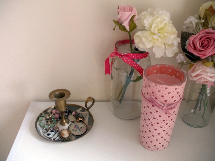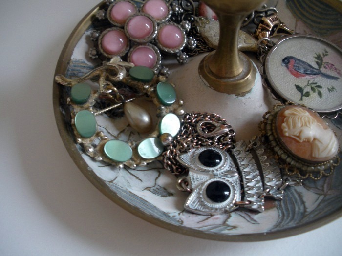 I bought the old hand-painted candlestick from a charity shop a while ago, and until now it has just sort of sat around on top of the shelves in our bedroom, not doing very much. I’m happy to report it’s now earning it’s keep, looking after my Grandmothers brooches and my newest charity shop find.