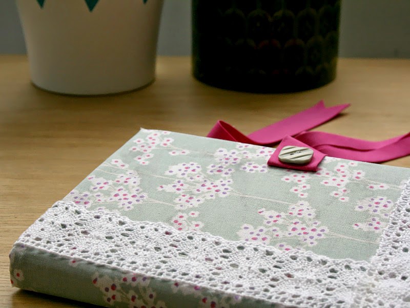 The instructions are really clear and easy to follow; a lot of times I’ve tried to follow a kit and have found myself spending half the time scratching my head and shouting, ‘but what are you TALKING about?” while glueing things to my hands. The instructions in the fabric kit were really comprehensive, and for the stitched version there were even little pictures that meant you could work alongside, and check you were getting it right. I also loved the bit at the back which gave pointers on ways to jazz up your finished cover; I added some lengths of lace and a ribbon tie, but armed with a glue gun, you could stick on anything from pompoms and paper shapes to bows and beads,