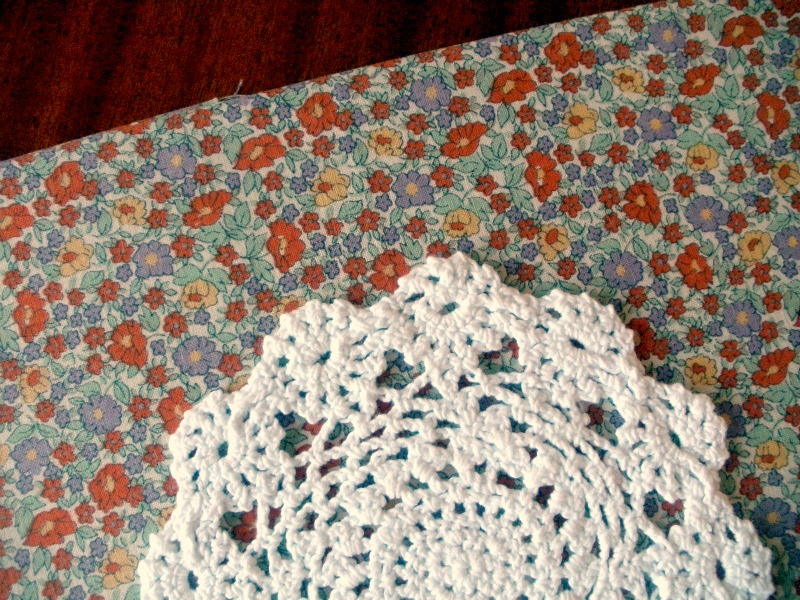A while ago I made this carrier bag holder, to hang in the hall in an attempt to remind us to take our own bags with us when we go shopping (it sort of worked – it reminds us to take the ones out of the hall cupboard instead!). I loved the fabric, but only had a limited amount as it came from a car boot sale, so wasn’t really sure what to do with the tiny leftover bit. Not big enough for a cushion cover, not enough to cut into patchwork, I was at a loss until I spied a lone doily sitting on my fabric shelf. ‘Hold on,’ I thought, ‘I might be onto something here….’
