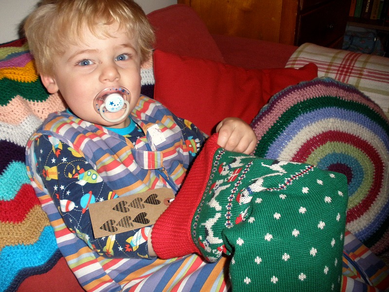 The Boy is three now, and this is the first year he’s actually understood what happens at Christmas. As you can tell, it pleased him greatly. |