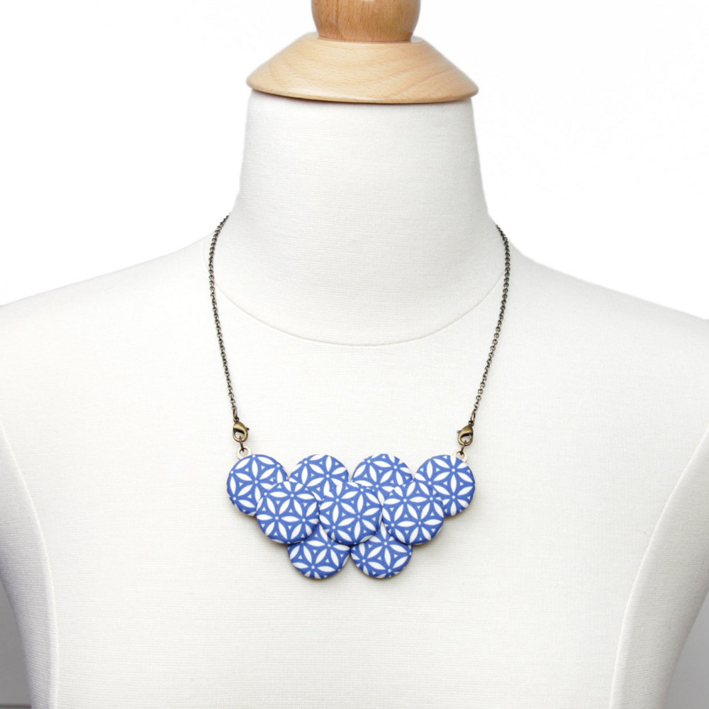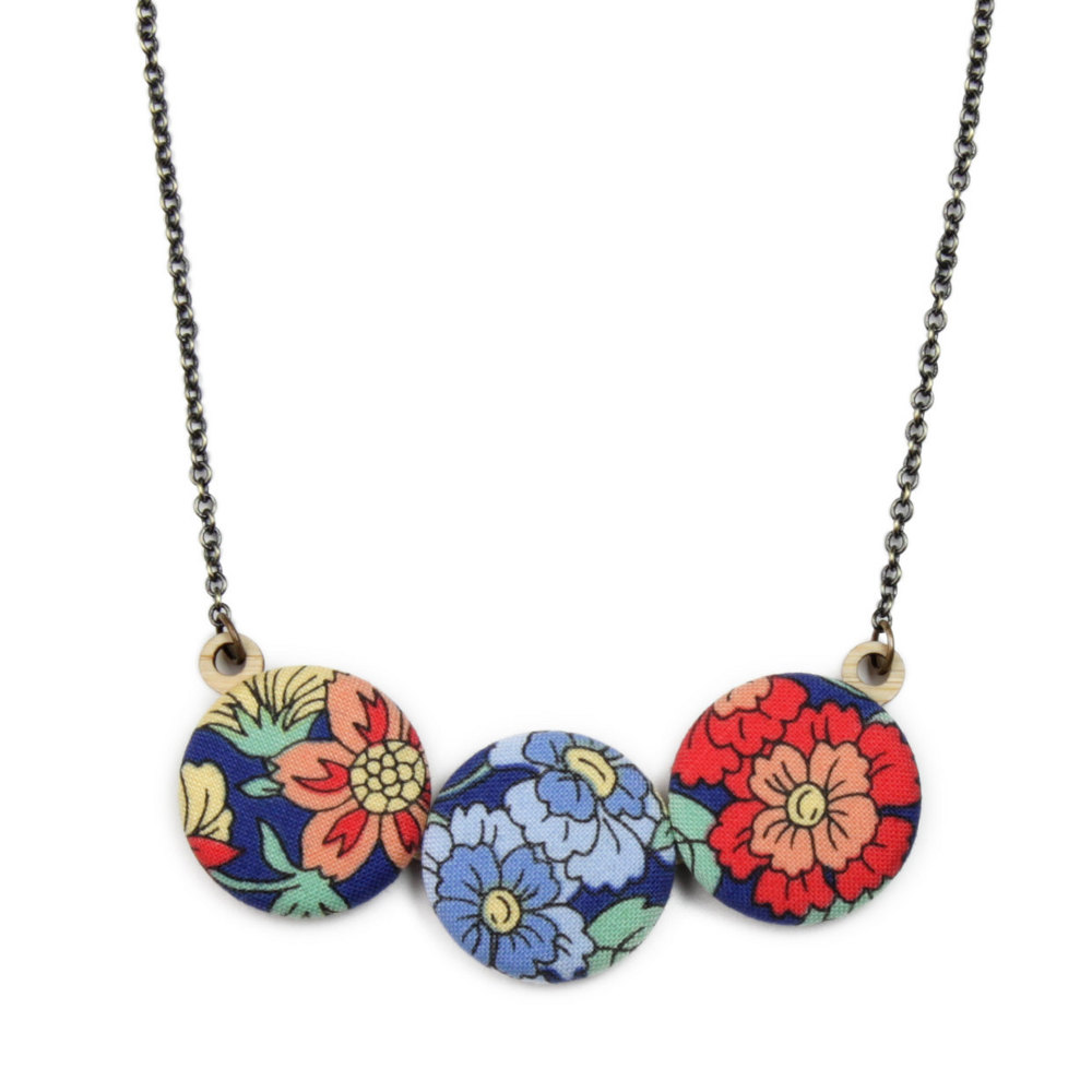 Molly and her husband Duncan, who named the business after Molly’s Grandmothers, Vivi and Dot, design the fabrics, before having them printed and then pressed into a button. The buttons are glued to the findings, and made into a range of amazing accessories, from necklaces to cocktail rings, hair clips to earrings. I’m massively in love with the larger necklaces, all featured above – one of my favourite ways to dress up an oversized top or t-shirt is buy adding a statement or bib necklace. Nothing better!