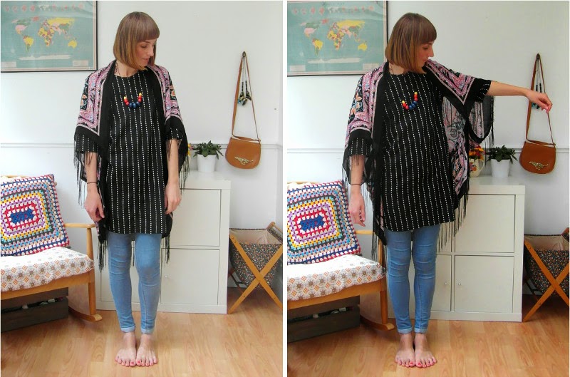 I love a good printed jacket, so all this talk of kimonos recently has been right up my street – colourful patterns, hippy-esque fringing and enough fabric to ward off late-summer breezes, but not so much that you swelter under the September sun (the weather down here has been brilliant all week, lucky us!). The only thing I wasn’t keen on was the price tags – I couldn’t find any in the charity shops and even on eBay they were going for quite a lot, so I had a look online to see how tricky they were to make. Answer – very. There was talk of seams and tucks and darts, and after about half an hour I gave up and decided to search for DIY instructions. I found a great tutorial for turning a scarf into a kimono on A Spare and a Pair, but I didn’t have any of the materials required (plus my scarf already had fringing), and patience is a virtue I don’t own – so I cobbled together my own kimono using my old scarf and some black thread. And, err, that’s it.