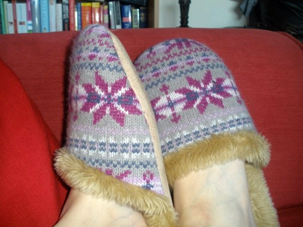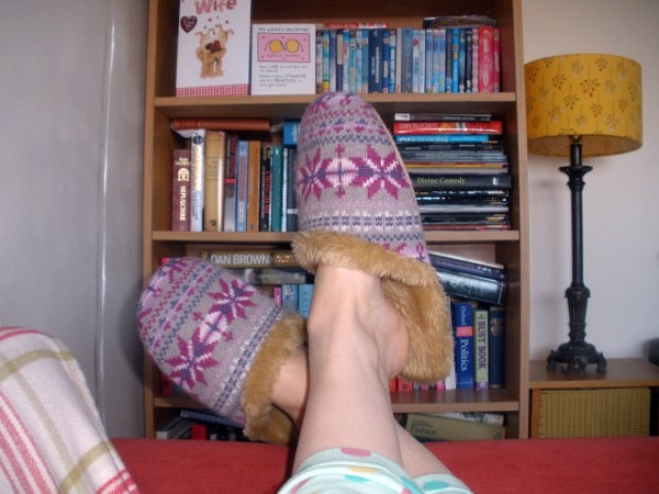 My Mum and Dad bought me some really lovely things…. (from top) a top from French Connection, which is made up of all of my favourite colours of the moment – olive green, mustard yellow and a variety of blues, the most beautiful little cardigan from White Stuff which looks like it really should be vintage, a teal velvet coat which has the BEST lining ever (also from White Stuff), and the most deliciously warm Fair Isle slippers, which I adore (and often find the Boy shuffling around the lounge in). The bottom photo shows all my Cath Kidston goodies from various people – the purse and butterfly hair clip were from my Mum and Dad, the tea towels and apron were from the In-Laws and the huuuuuge piece of fabric and travel sewing kit were from my lovely workmates.
