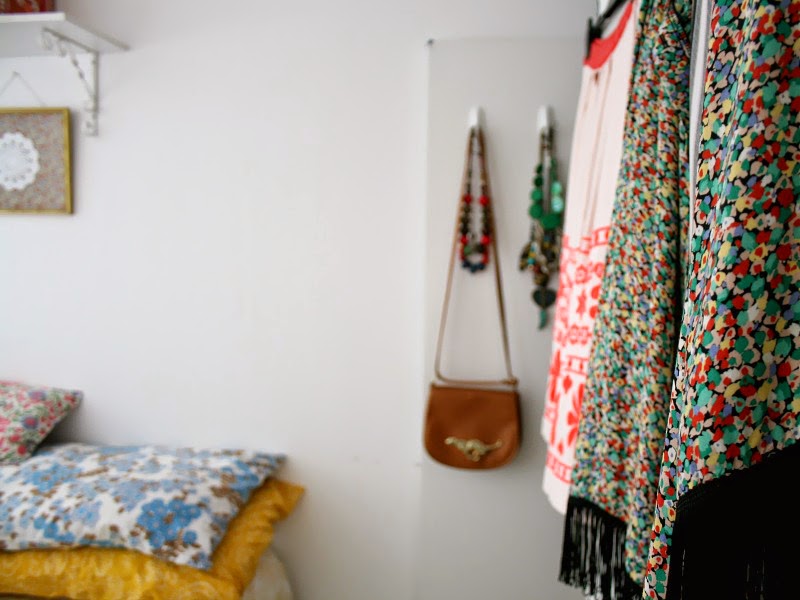I also use the outside of the doors as a kind of storage-display mash-up. You can fit a good four dresses or tops on the outside, so I just rotate things every week; at the moment my favourite things are a printed dress from ASOS, any vintage blouses and my best ever eBay bargain – the Topshop skirt pictured above; it’s absolutely huge and has embroidered squirrels and birds on it, which actually sounds way more twee than it really is.
