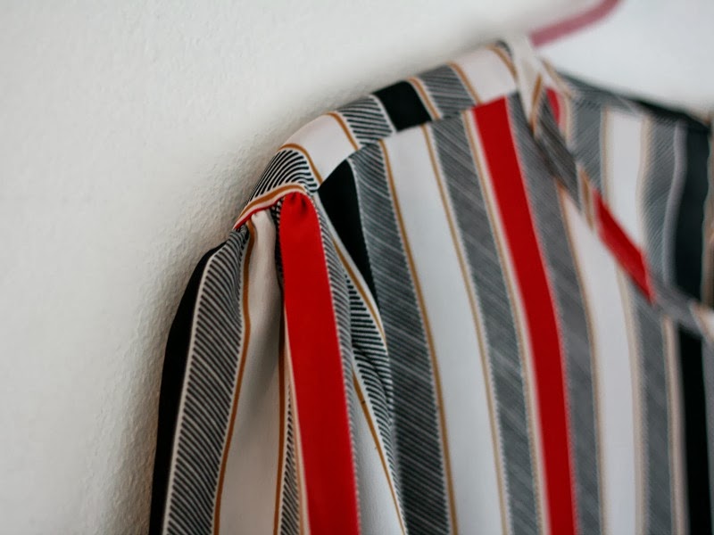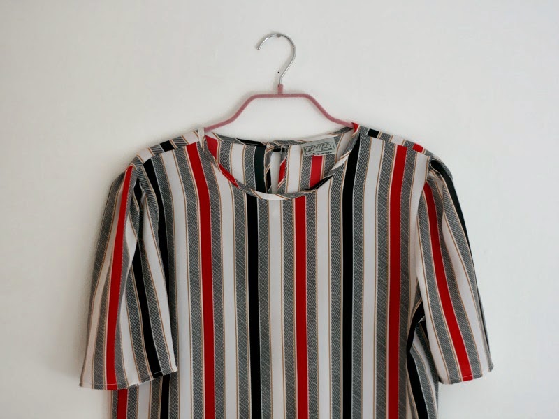 I found the wonderful puff-sleeve blouse in a charity shop I don’t visit very often, because it’s right out of town, so it was actually a happy little accident. It actually started its life in my wardrobe with full length sleeves, but after a small tussle between it, the Husband and the iron, they ended up at just about elbow length. It leaped out at me amidst a sea of dull lycra t-shirts and bootcut jeans, and I love it for the ace vertical stripe print – something a bit different from all my other breton-style tops!