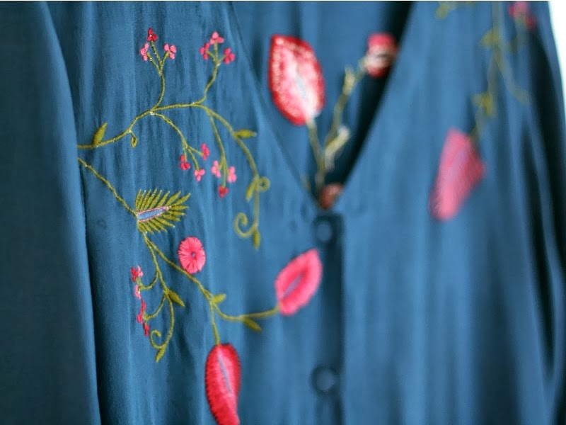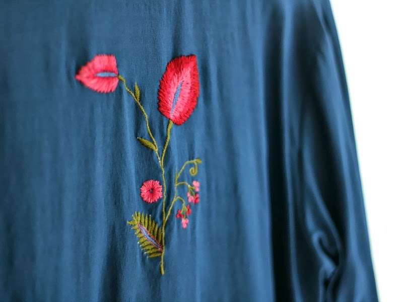 I think the award for ‘Best Thrifty Find in the Entire World, Ever’ has to go to this little vintage blouse, which I found nestling on a rack in my local Barnardos shop, and cost me exactly £2.99. It has no labels, and is made of what I think might be a viscose / silk mix, but the embroidery on it is absolutely exquisite. Tiny leaves, stems and petals adorn the front and sleeves, and there’s even a single motif in the centre of the back; it feels quite delicate, so it might well end up being one of those things that is put on display on the bedroom wall.