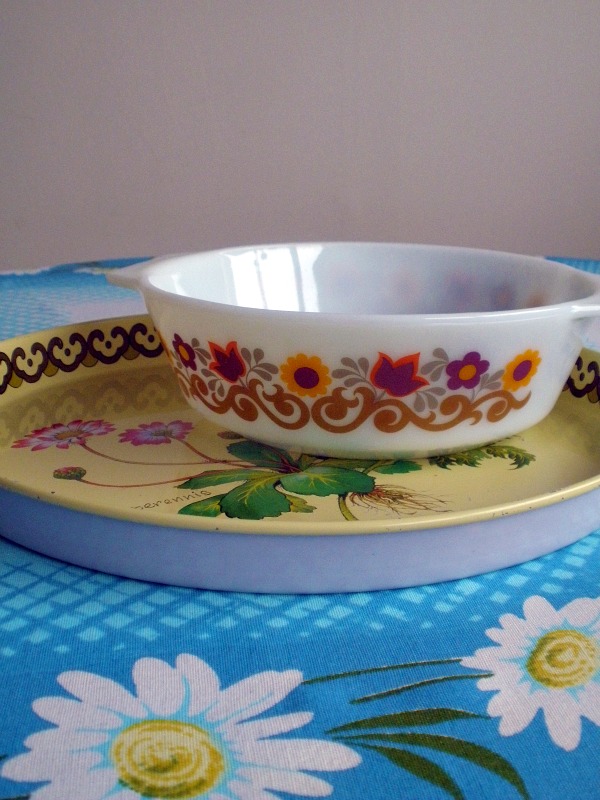 I gave an audible gasp when i caught sight of that Pyrex dish – it's perfect!! Love the colours too.I found a little 70s enamelled casserole pot with`a similar design in navy blue at the weekend. I fell in love on the spot and at 99p there was no way it wasn't coming home with me.