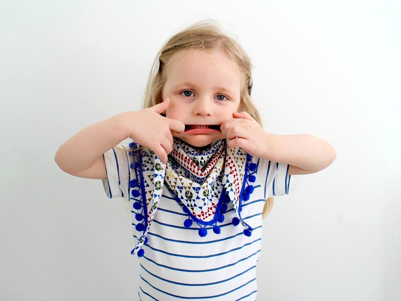 Apart from Lottie, there was a unicorn head, some Lego, some cars, the sparkly sneakers and several books. I had grand ambitions to make loads of stuff (I even made a list!), but only had time to get one finished – a suitably loudly printed triangle scarf, complete with blue pompom trim. I made it from an old IKEA pillow case, and it all started rather well – I even made a template from paper first – but soon descended into raw-edge-hell. Still, once the trim was on (look how straight and even it is! Look!), it looked pretty good, and she seemed suitably pleased with it. Although you wouldn’t know it from the only picture I managed to get…..