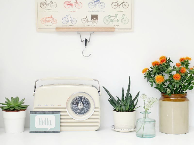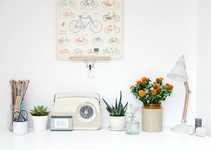 One of the rooms in the house I’ve been changing around is the conservatory; this is my working space, and it’s where I have my desk, craft supplies, yarn, printer and teetering piles of paper beautifully organised accounting records. Like the other rooms, I’ve been having a clear out, and have gone from having something on every surface to lots of clear space for working, photographing and filling with plants. I took everything off of the wall, filled in the holes and ripped off the wretched wonky dado rail, and now I’ve got a lovely white background for photographing against. I’ve also added some more plants, in the hope that they survive longer this time, and my beloved Bush radio (usually tuned to Radio 4, I’m a sucker for the Archers and the Afternoon Play….) is perched on the desk as well. Everything else is stored in cupboards elsewhere in the room, and the whole space looks so much lighter, brighter and fresher.