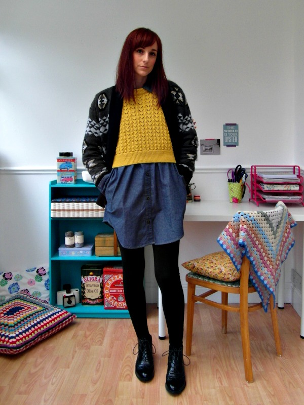 The dress is from lovely ethical brand Seasalt Cornwall (you can read about their environmental aims here), and it was a birthday present from my parents – I’ve been hunting for a denim shirt dress for absolutely ages, and this one popped up at just the right time. The mustard yellow sleeveless jumper-vest-thingy came from a charity shop a couple of years ago, and it’s one of my most loved knits. The aztex cardi came from eBay and was a bargain £4 including postage – I love it for its softness, but wish it had pockets. I do love a pocket.