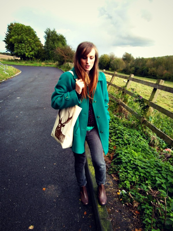 A chilly Autumn day in the country calls for three things – boots, a good coat and knitwear. I went with my new bargain eBay boots (£20 for new, unworn Schuh leather chelsea boots – actually a little small, but hey, they’ll stretch!), my beloved teal coat and a jumper that used to belong to my Mum, and was knitted by her own fair hands. All topped off with a reworked vintage necklace, and brand spanking new tote bag.