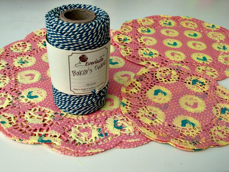 Lay out your length of twine, and work out how many doilies will fit along it, and what order you want them to sit in.