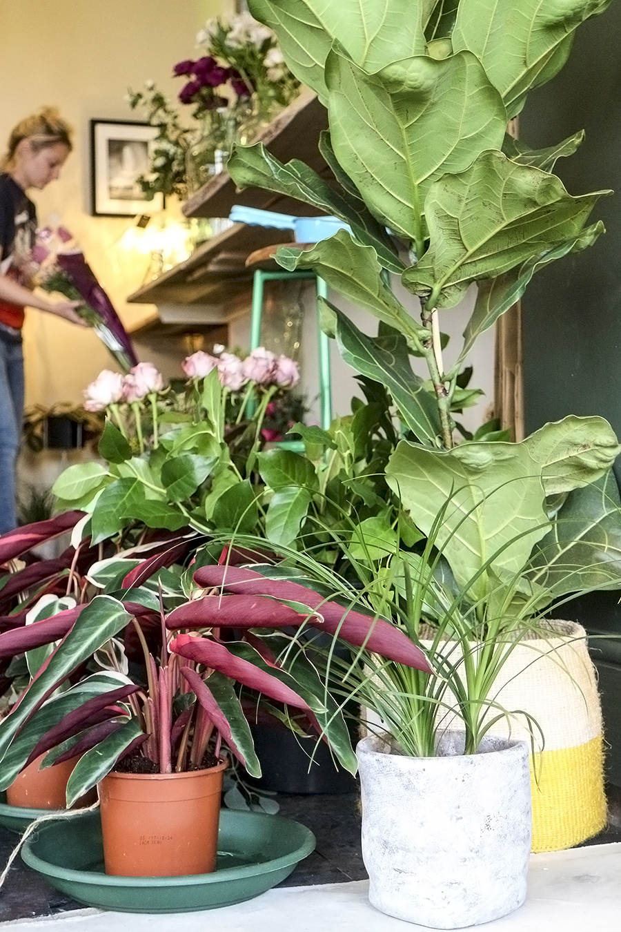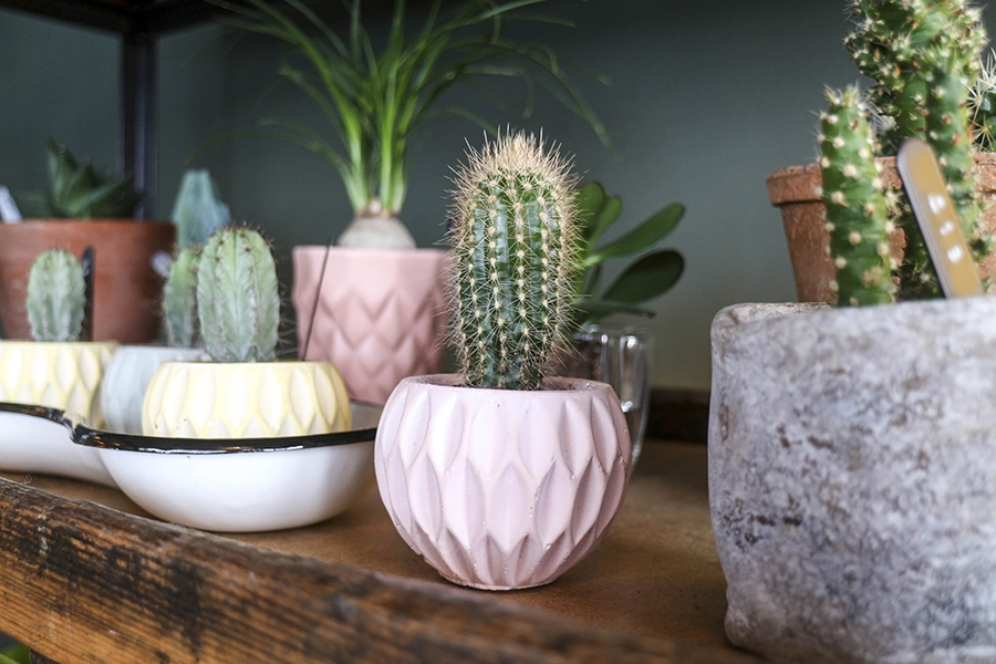 The front of the shop is all beautifully dark walls, a spectacular archway and original features, and is the home to most of the plants and baskets. Industrial shelving is stacked with geometric pots, enamel trays and concrete accessories, and there is greenery everywhere; fishtail succulents jostle for space with pilea peperomioides, marantas sit snuggly inside rustic vintage clay pots and the hugest of cacti are displayed in handwoven baskets. There are little extras everywhere; bunches of dried lavender, air plants nestling in corners and the walls are adorned with handmade glass terrariums. In short, it’s catnip to plant lovers.