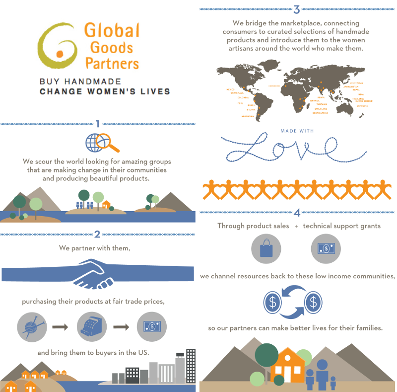 Founded by Catherine Lieber Shimony and Joan Shifrin in 2005, Global Goods Partners has been working with women in some of the poorest communities around the world to alleviate poverty, promote social justice and provide families with a decent quality of life. The infographic below puts it into simple terms much more effectively than I could!