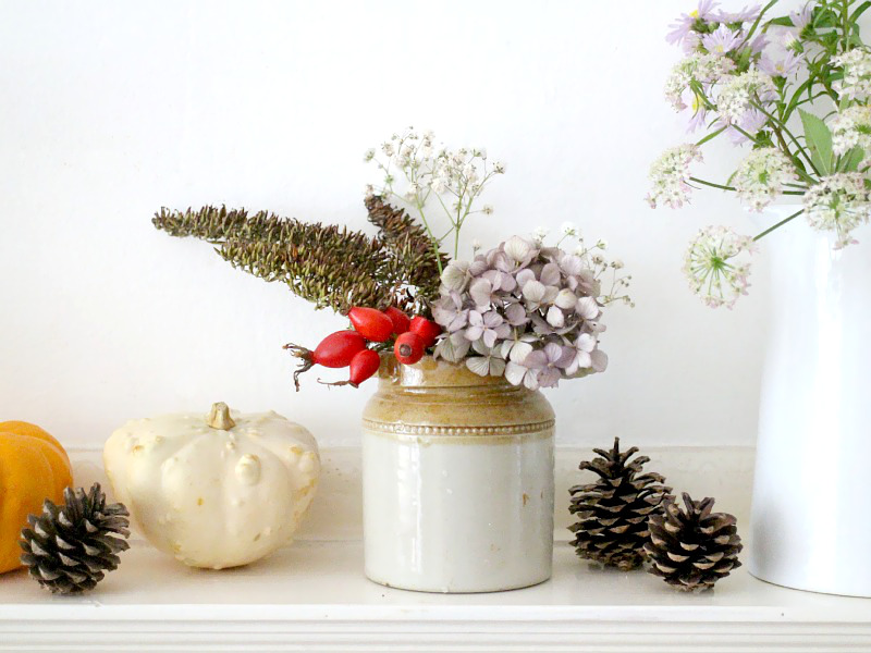 As well as the gourds, I’ve included my prized Old Man’s Beard, a few of my gazillion pine cones, my treasured dried hydrangea, some rosehips, Michaelmas daisies, dried honesty and some seed heads. What I love most about collecting at this time of year is that a lot things are already dried, which means they last ages longer – which means you don’t have to spend quite so much time sweeping up dropped petals!