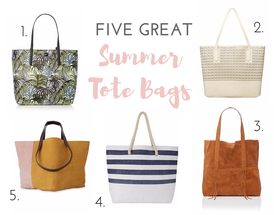 1. Palm Print Medium Tote Bag, £35, Paul’s Boutique // 2. Laser Cut Tote, £15, Dorothy Perkins // 3. Olympia Tote Bag, £24, Label Lab // 4. Georgia Stripe Bag, £19.50, Phase Eight // 5. Colourblock Nubuck Tote, £175, Whistles all at House of Fraser