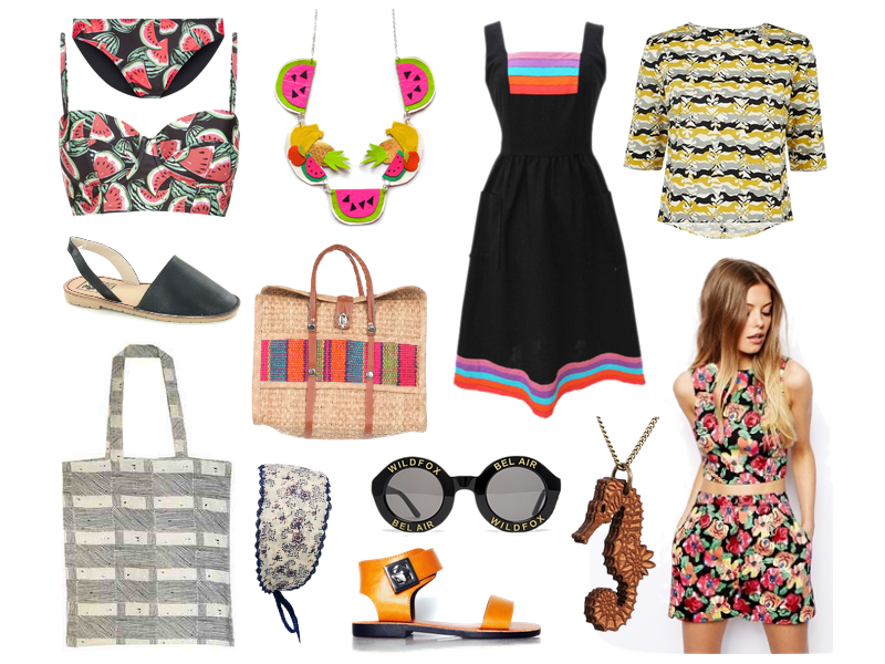 | From left: Bikini : New Look // Watermelon Necklace : Boo and Boo Factory // Vintage Sundress : Love Miss Daisy // Top : People Tree // Top and Shorts : ASOS Green Room // Seahorse Pendant : Tatty Devine // Sunglasses : ASOS // Vegan Sandals : Fashion Conscience // Headband : ASOS // Tote Bag : Fashion Conscience // Vegan Sandals : Fashion Conscience // Straw Bag : Rokit |