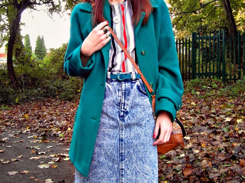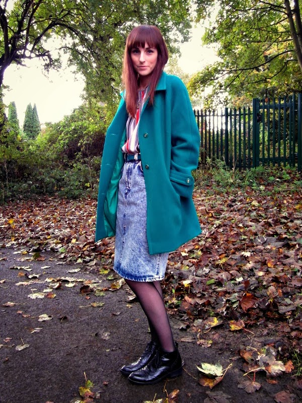 Autumn and Winter weather pretty much makes me want to put pyjamas on, and then not take them off again until Spring rolls around; the endless rain that leaves everything soggy underfoot, grey skies and dark mornings all make creative dressing that bit harder. I’m incredibly lazy when it comes to clothes; I like patterns and colours; bright tights, printed dresses and lots of geometrics and vintage, but when the weather turns to shit, all I want to do is wear jeans and big crazy jumpers. That said, we had a rare rain-free day a few weeks ago which was the perfect time to give my new acid wash skirt an outing (I started this post a while ago, then it languished in my ‘drafts’ folder for a while, neglected and forgotten. You can tell it’s old, because the ground in the pictures is still covered with a carpet of leaves!). I hate tights and I hate the cold, but my oh my, I love this skirt.