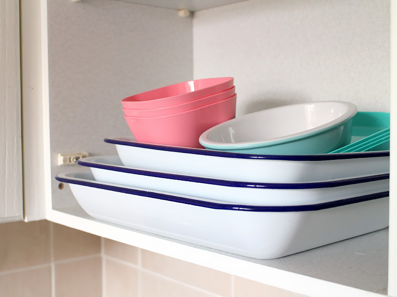 The corner shelves in the photo above are really annoying – they’re really far apart and teeny, so technically a total waste of space and pretty useless. We’re going to be ripping (probably literally ripping as everything in this house seems to have been glued in place!) them off and replacing them with some nice long open shelving on the adjacent wall with hooks for utensils.