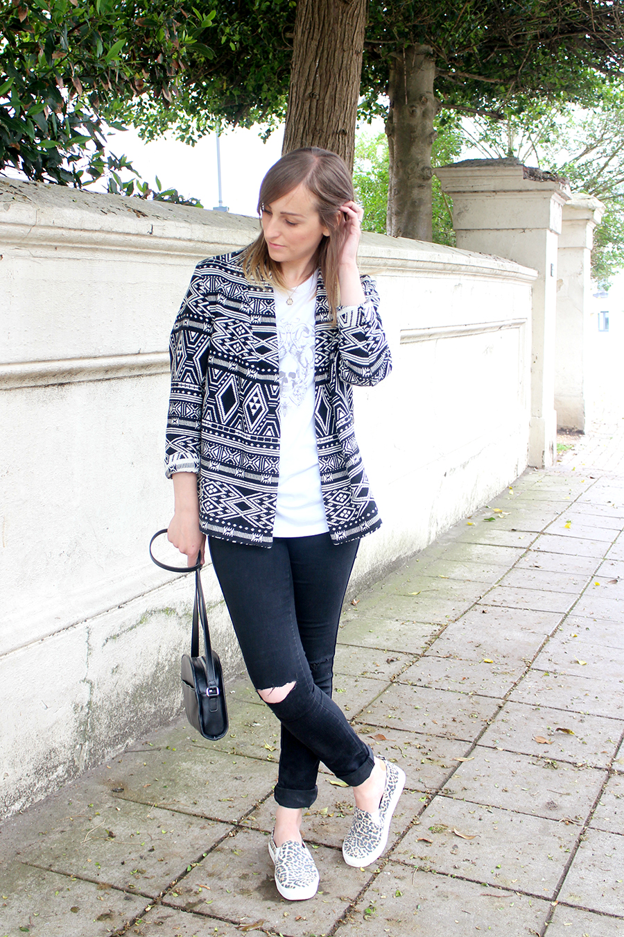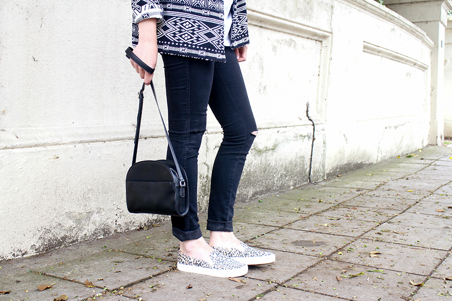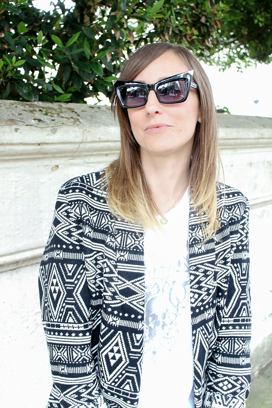 The second part of the outfit in the ethical category is the jacket; I found it on sale in H&M, and it’s from the conscious collection, which is the part of the brand that promotes earth-friendly manufacturing processes. I’ve always loved aztec prints and patterns, and I’m a big fan of the oversize look as well, so it was a win-win! (The shoes are from H&M, the top is a man’s t-shirt from Paul Smith and the sunglasses and bag are both from Monki. When I pulled the sunglasses out, Ali howled with laughter and cried, ‘wow! They’re a bit special!’ Yeah, thanks husband.)