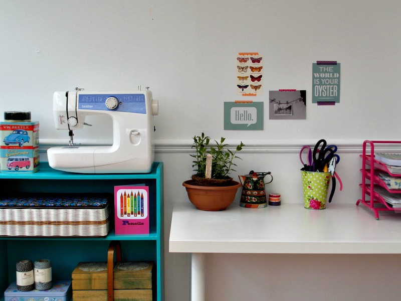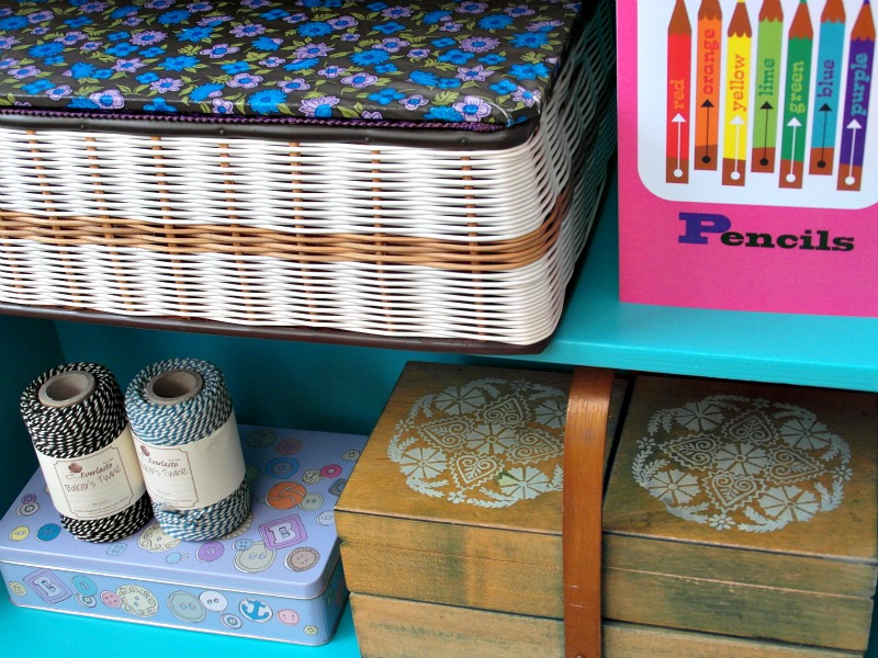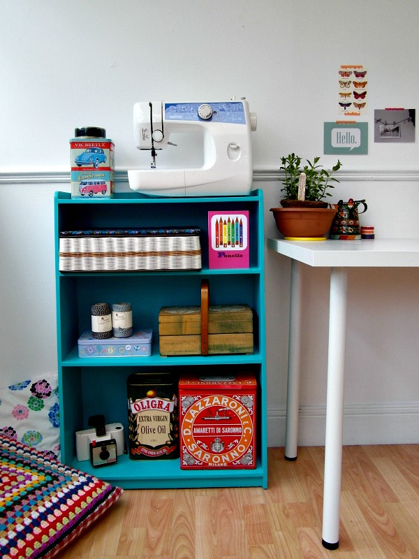 I’m so pleased with them, I can’t even begin to tone down my enthusiasm. I actually kissed them when they were finished. The colour was ace, the paint went on evenly and the varnish sealed the deal perfectly (literally, guffaw). They’re now home to various lovely things, namely two vintage tins that I’m planning on using in the garden as planters (this might actually not happen, as the thought of them rusting terrifies me…) and my vintage sewing boxes. This seems like a good time to share the little corner of the conservatory that I’ve clawed back from the sticky grasp of the kiddos – it was a playroom, but I seem to be amassing so much crafty stuff that I decided I was going to give it all a home. (Just so you know – this side of the camera was impeccably neat, but the other side looked like an explosion in a toy factory. Real life, people!)