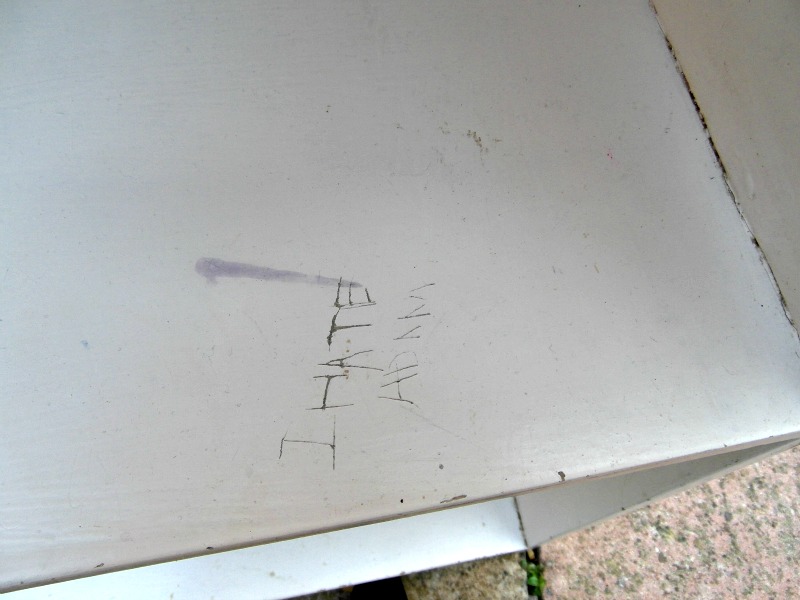In the end, I decided that I wasn’t going to give into my laziness, and that since I’d bought them, I was going to bite the bullet and clean them up to use in the house. They were covered in scratches, graffiti, chips and gouges, and someone had welded the tackiest (but not in a good way) hook onto the side. Out came the sander, and off we went.