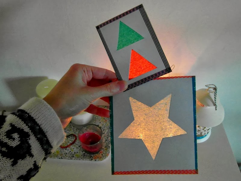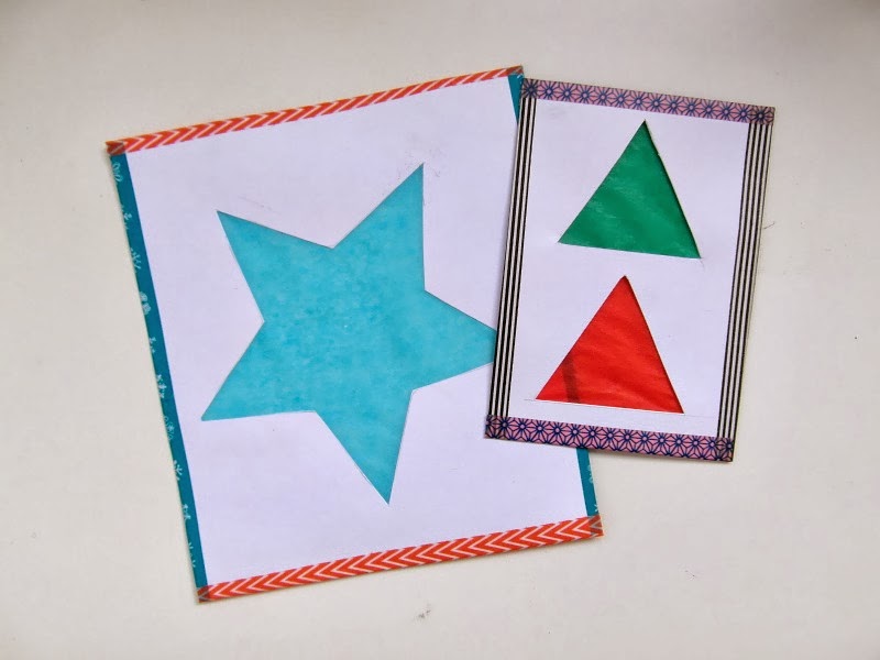 Ben and I had a bit of a crafty afternoon making cards and constructing stained glass windows from card and coloured tissue paper; although actually it ended up with me sat at the table cutting out shapes, while Ben sat and watched the cBeebies Christmas pantomime from the comfort of the sofa. Humph. Anyway, I made them by folding a length of card in half, then drawing a shape on one side, and cutting it out. I glued a layer of tissue paper over the hole, folded the card back over and then stuck washi tape around the edges. Quick and easy – the best kind of crafting!