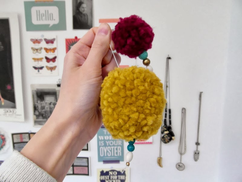 After I finally got round to buying a Clover pompom maker (I bought mine before you were on the telly with your Christmas special, Kirsty Allsopp, so ner ner), I decided that this festive season was going to be packed with the woolly little blighters. I made pompoms to stick onto presents, pompoms to hang up, pompom garlands, and giant beaded pompom decorations (top image). I made these by making two pompoms of different sizes, then threading them onto a long piece of cotton. I popped some beads on either end, tied a loop between the pompoms and voila! You could easily join loads of these together to make one giant pompom-bead-extravaganza, or hang loads of them from the ceiling…. the possibilities are literally endless!