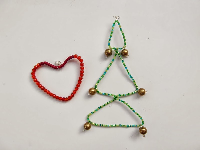 First up, I made some little wire and bead decorations, which basically consisted of threading a selection of beads onto jewellery wire, then twisting it into different shapes until it stayed in place – I secured it at the top, by curling the wire into two loops with needle-nose pliers, which meant there was somewhere to thread the cotton so it could be hung on the tree, or on a garland. I found that it was best to use a relatively thick wire, as it meant it didn’t go all limp when I bent it, and held the shape fairly well – I think I used 2mm or 3mm.