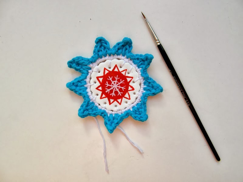 - Decide what design you’re going to do – I went with simple triangles (everybody loves a triangle, plus it’s the easiest shape to do), snowflakes and rows of simple cross-stitches – and use a toothpick to create the holes. Don’t forget to make a hole for the thread that it’ll hang by.