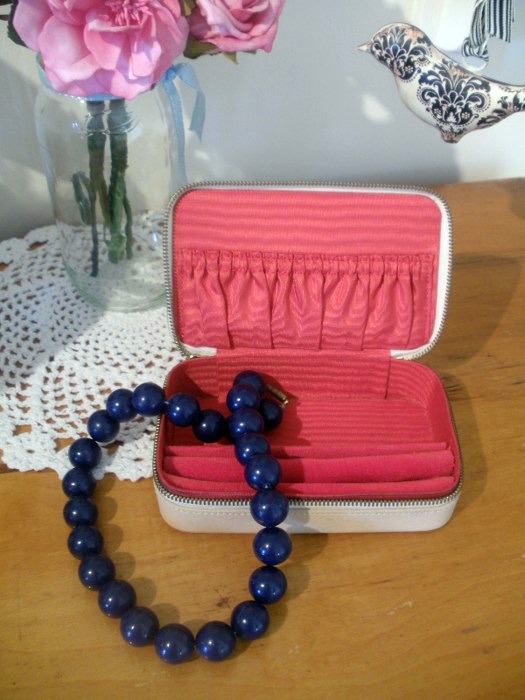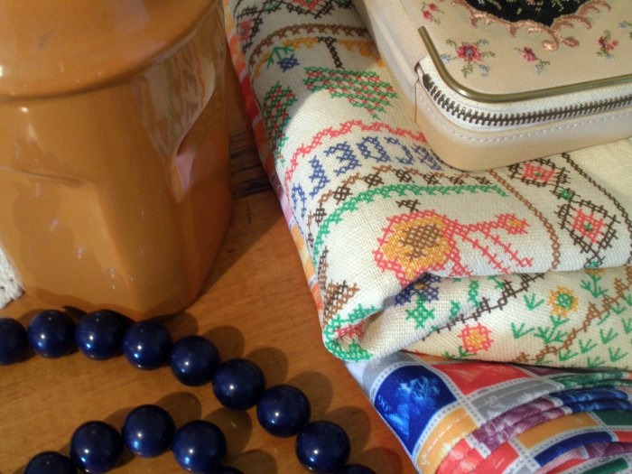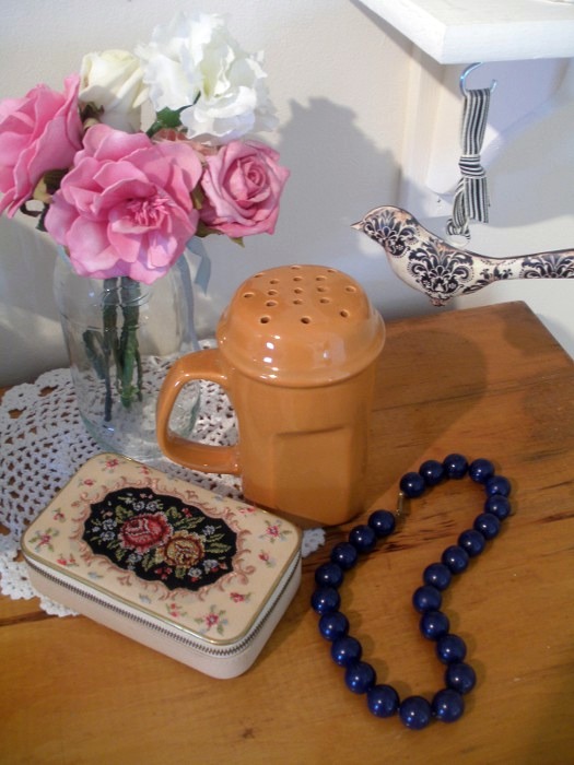 My thrifty finds were tip top as well – an orange flour shaker, a small tapestry sewing box (both of which were immediately homed on the shelves with my blossoming camera collection) and a beaded necklace for a mere £1. Happy days.