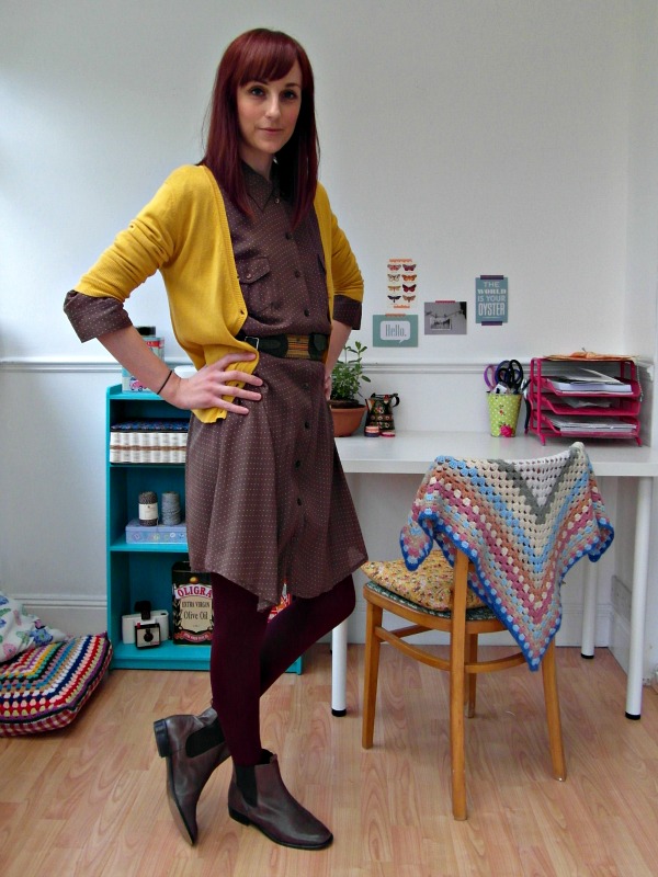 I added it to a spotty dress from eBay, a charity shop mustard cardi and some eBay chelsea boots, and came up with this little number: