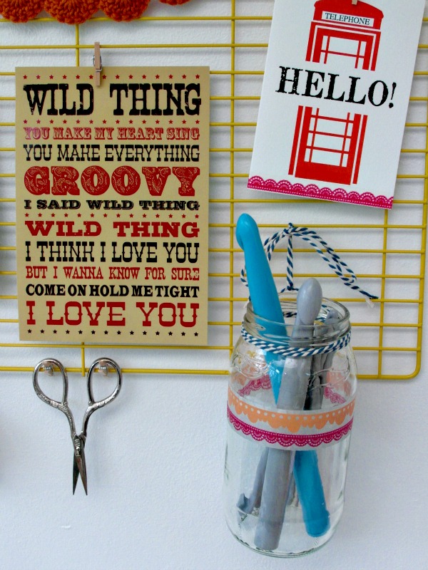 What I wanted most was somewhere to store my crochet hooks, so I wound some washi tape and bakers twine round a jar and then just tied it on. I’m ‘knot’ so good with securing things (guffaw guffaw), so to be honest, I’m just keeping my fingers crossed that it stays up.
